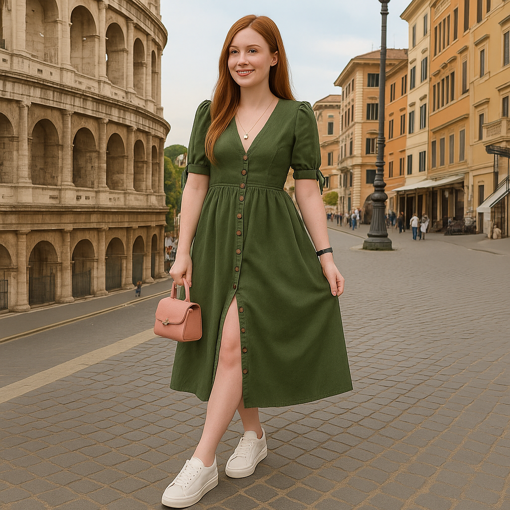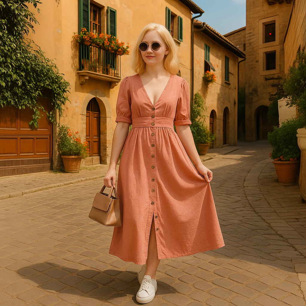 - Elegant Details – Wooden buttons and delicate sleeve bows add a refined, feminine touch.